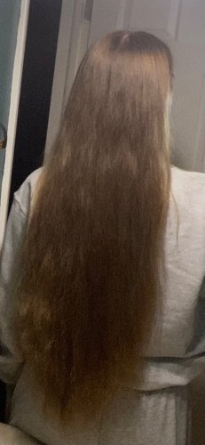 Long thick naturally a little wavy hair- pictures are after washing with NO product in – hair was a little damp so appears just slightly darker in the pictures